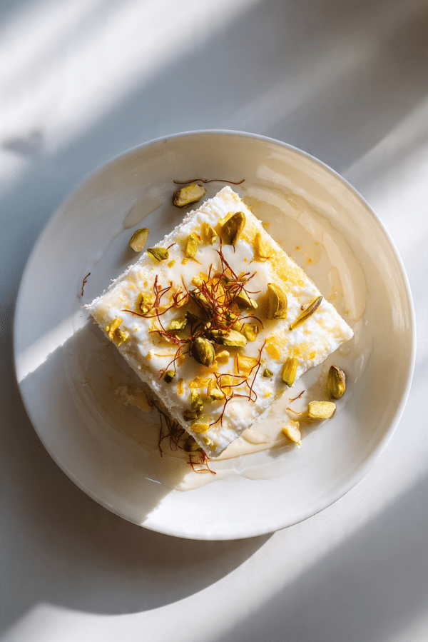 Serve on a glass tray with saffron threads and chopped pistachios scattered around. Add rose petals or tiny gold sprinkles on top for visual wow. A drizzle of extra milk syrup on the side makes it look as indulgent as it tastes.