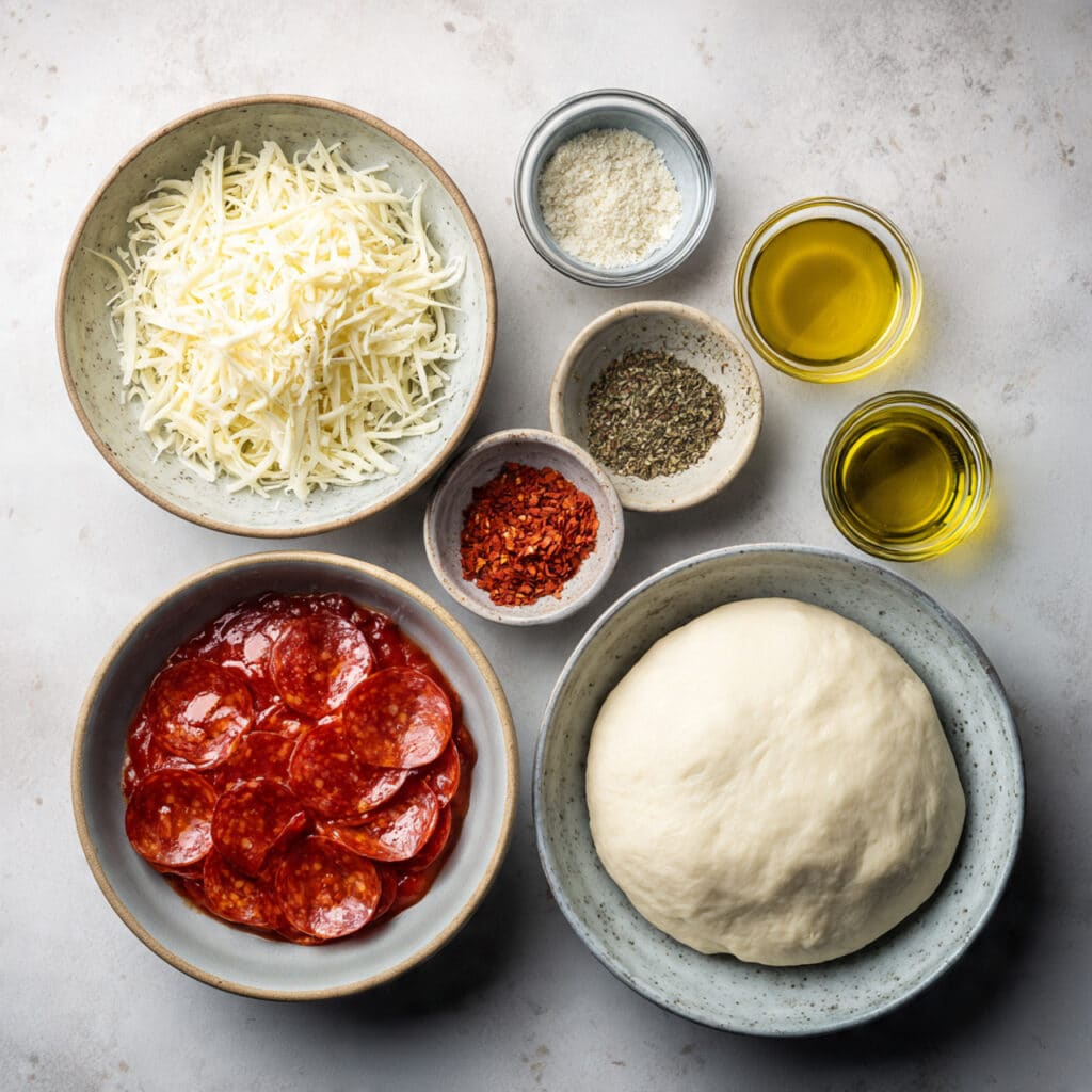 - Pizza Dough: 1 sheet or about 250 grams, forms the soft yet crisp outer layer