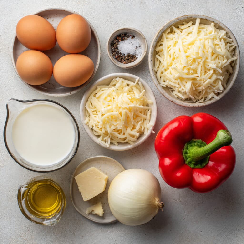 - Assemble the Dish: Pour the egg mixture into the dish, then add cheese, bell pepper, and onion evenly.