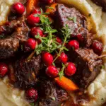 A cozy, comforting stew featuring tender beef, sweet-tart cranberries, and a cider-infused gravy, perfect for chilly nights.