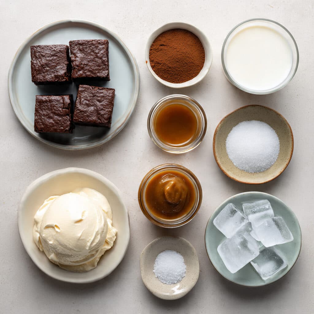 A rich and creamy brownie caramel frappe that blends fudgy brownies with smooth caramel and vanilla ice cream for an indulgent, dessert-style drink served ice cold.