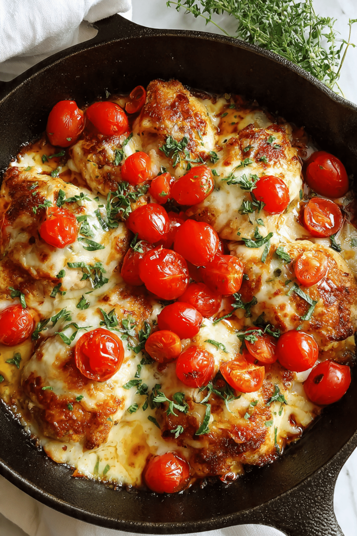 Juicy pan-seared chicken thighs topped with melty mozzarella and a fresh tomato-basil bruschetta mix. This one-skillet dinner is packed with flavor, easy to make, and perfect for any night of the week.