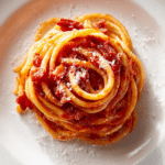 This dish already has beautiful color, so lean into it. Use a white bowl or plate to let the red sauce and pale pecorino pop. Twirl the pasta neatly in the center and let a few crisp guanciale pieces stay visible on top.