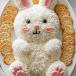 A playful and creamy Bunny Cheese Ball coated in shredded mozzarella and served with crackers and pretzels, perfect for parties and spring gatherings.