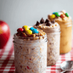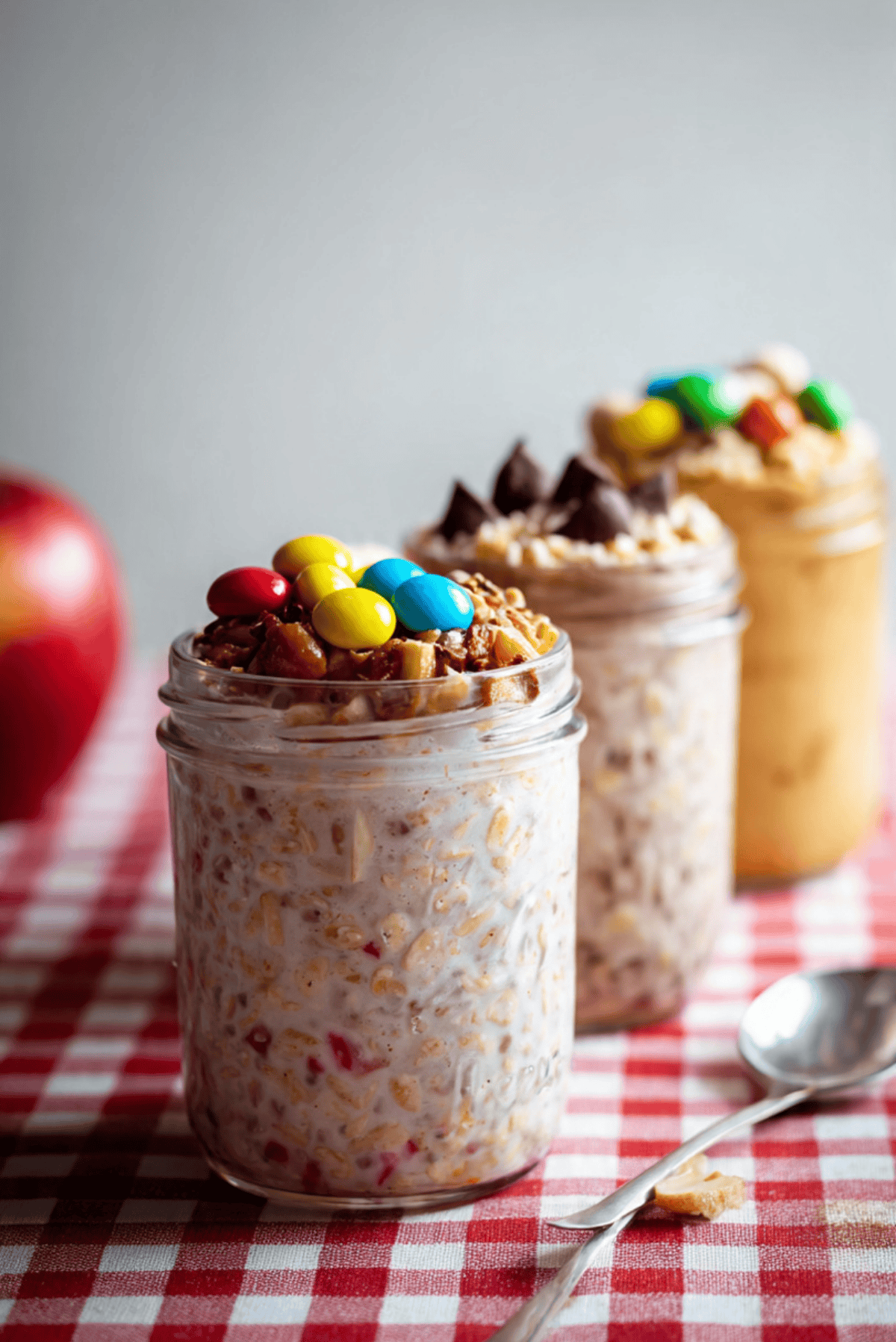 Creamy overnight oats layered with crisp apples and sweet caramel, topped with fun, crunchy toppings for a delicious make-ahead breakfast treat.