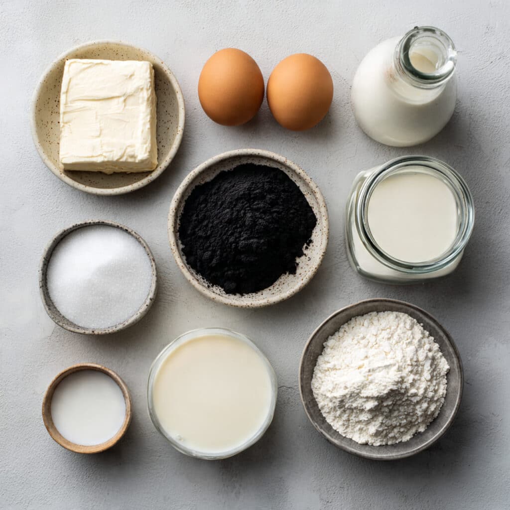 - Combine Ingredients: In a large bowl, whisk the softened cream cheese and sugar until smooth. Add the eggs one at a time, whisking gently after each addition. Pour in the heavy cream and vanilla extract, then whisk until fully combined. Sift in the flour, charcoal powder, and salt, then mix just until the batter is smooth and evenly dark.
