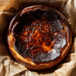 A dramatic and creamy Basque-style cheesecake with a dark caramelized top, a silky custardy center, and a touch of food-grade activated charcoal for a bold look.