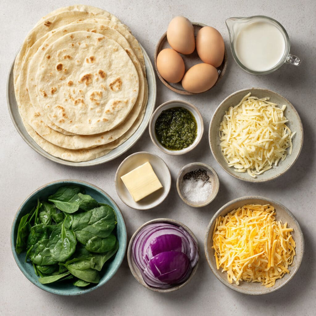 Basil pesto: This is the flavor booster that changes the whole breakfast. It brings basil, garlic, cheese, and richness in one spoonful, which makes the wraps taste far more layered than the short ingredient list might suggest.