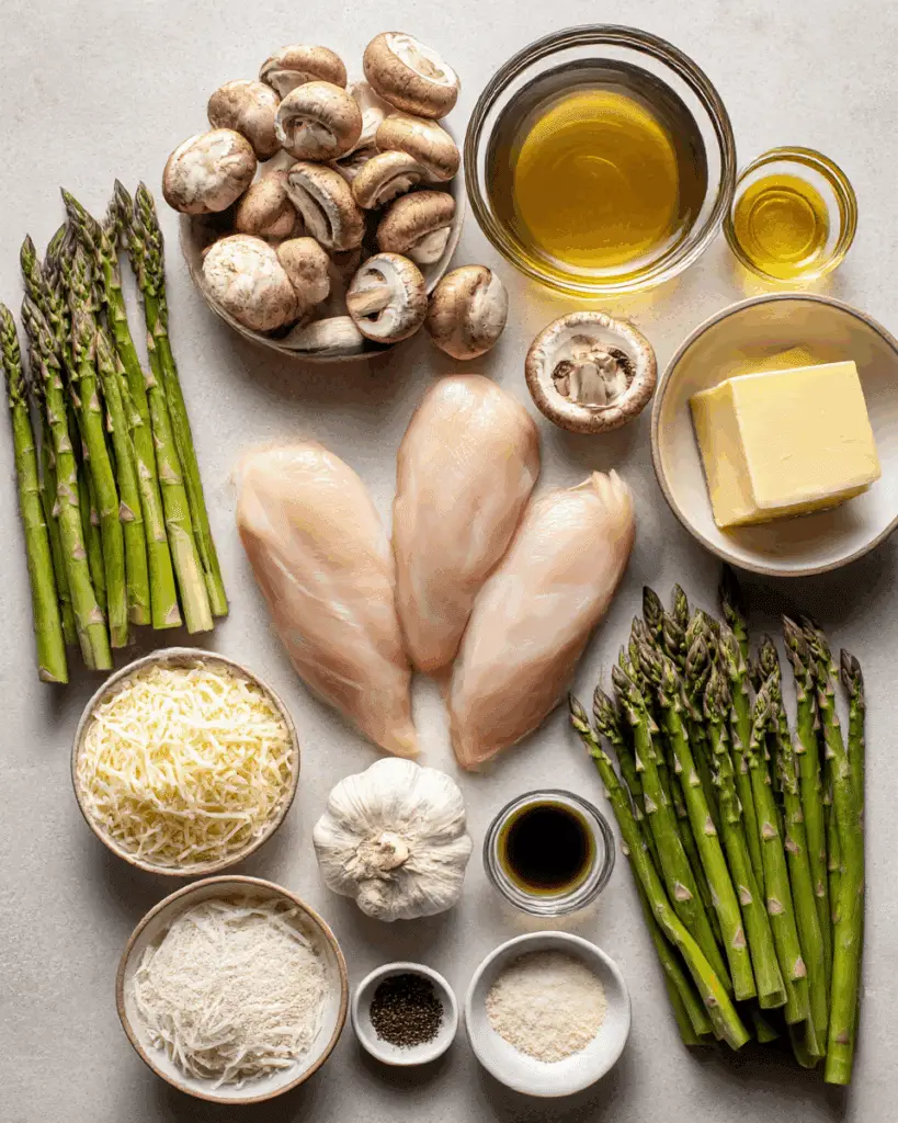 The magic of this dish lies in the contrast. You’ve got tender, seared chicken soaking up a buttery mushroom sauce, stretchy cheese that pulls with every bite, and crisp asparagus that adds just the right pop. Each bite blends earthy, creamy, and savory notes with a hint of sweetness from the sauce.