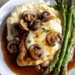 The magic of this dish lies in the contrast. You’ve got tender, seared chicken soaking up a buttery mushroom sauce, stretchy cheese that pulls with every bite, and crisp asparagus that adds just the right pop. Each bite blends earthy, creamy, and savory notes with a hint of sweetness from the sauce.