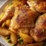Golden, crispy chicken simmered with garlicky white wine, tender potatoes, and sweet green peas—Chicken Vesuvio is a Chicago classic packed with flavor and heartwarming comfort.