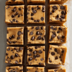 Rich, chewy cookie dough bars loaded with chocolate chips and made safe to eat by heat treating the flour. These no bake style bars are sweet, buttery, and perfect for sharing or snacking.