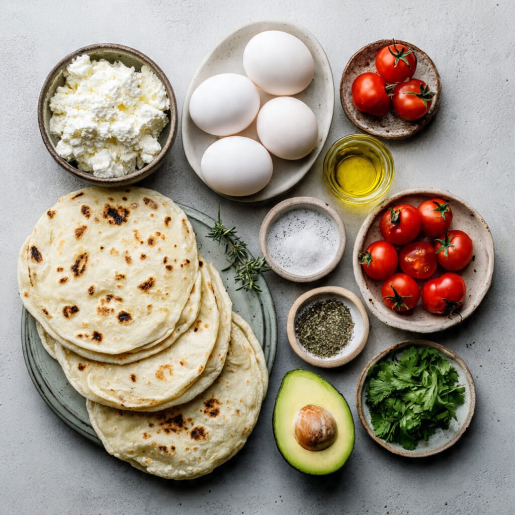 - Finishing Touches: Fill each tortilla with the egg and cottage cheese mixture, then top with tomatoes, avocado slices, and fresh herbs.