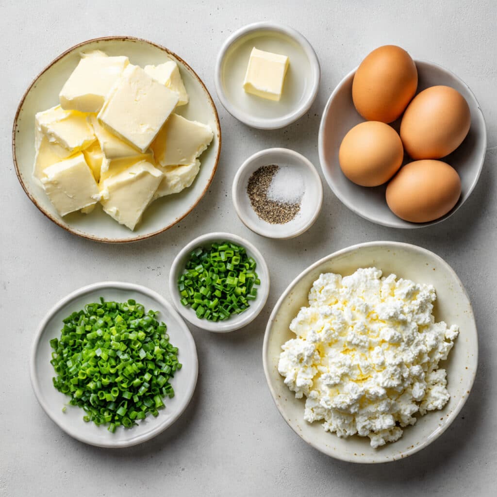 - Cottage Cheese: ½ cup, full-fat. Adds creaminess and those signature tender curds.