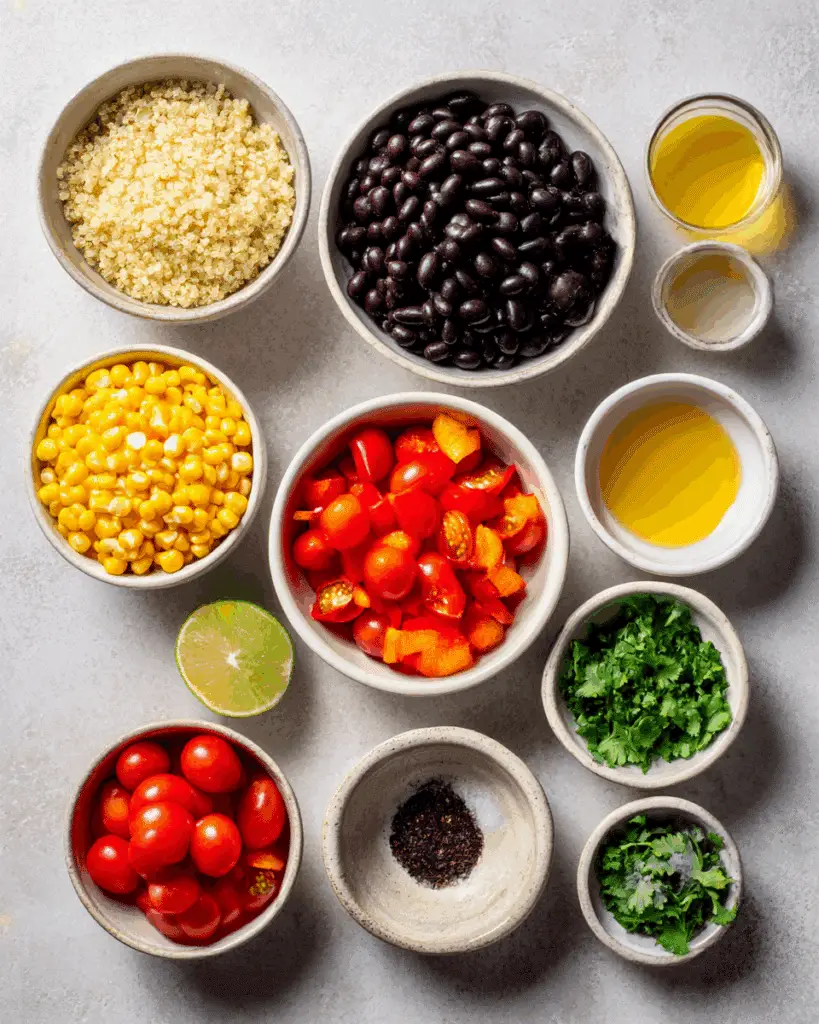 - Assemble the Dish: In a large bowl, combine quinoa, black beans, tomatoes, bell pepper, onion, and cilantro.