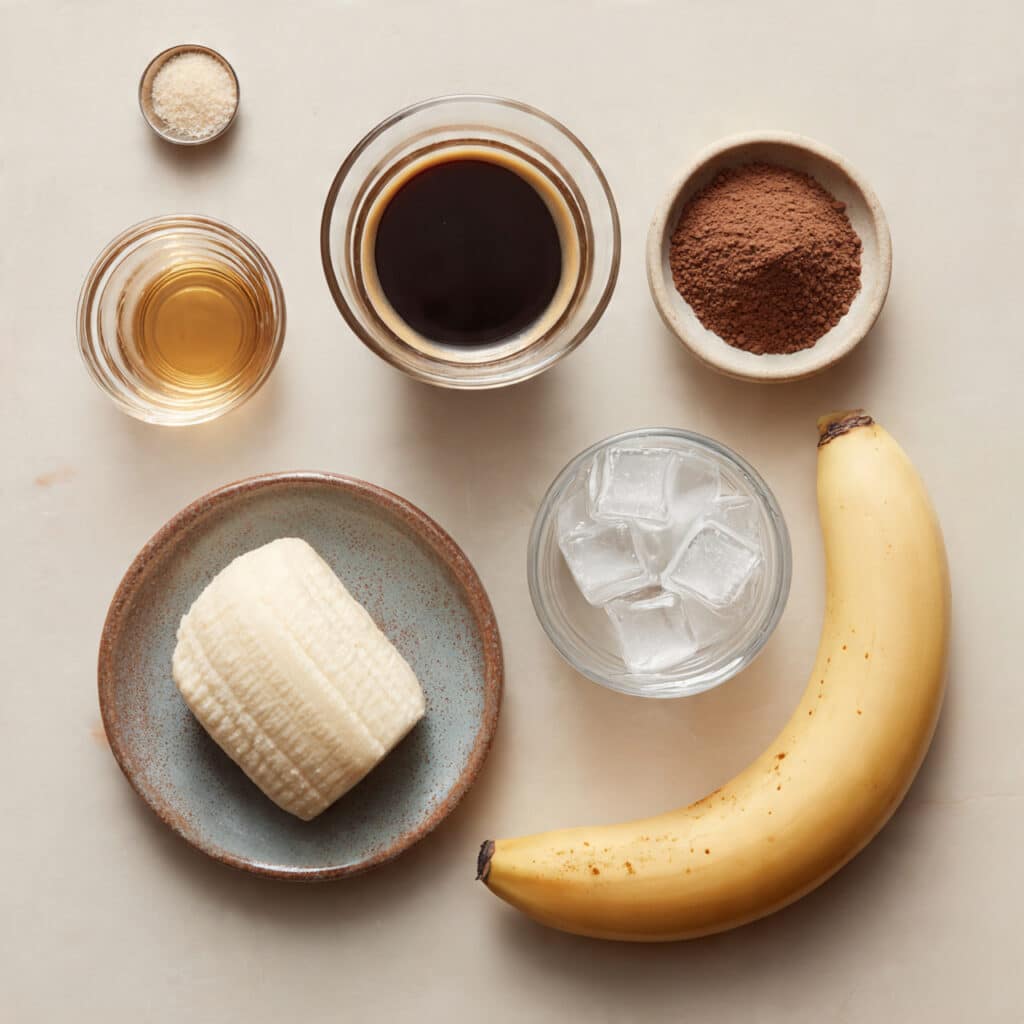 - In a blender, combine frozen banana, cooled espresso, oat milk, cocoa powder, maple syrup (if using), and ice cubes.