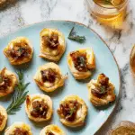 These Fig, Pecan, and Brie Bites are the ultimate party appetizer—flaky puff pastry filled with creamy brie, sweet fig jam, and crunchy pecans, all finished with fresh rosemary. Fancy without the fuss, and ready in under 30 minutes!