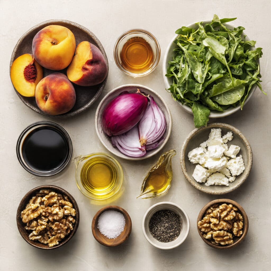 You can prep the salad ingredients ahead of time—slice the peaches, crumble the cheese, toast the walnuts, and make the dressing. Store them separately in the fridge. Assemble and dress the salad right before serving to keep everything crisp and fresh. Leftovers? Keep undressed salad in a sealed container for up to 1 day.