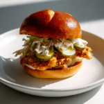 This burger is a perfect storm of flavors. The buttery richness of garlic knots pairs surprisingly well with the bold, spicy character of Nashville hot chicken. Add a creamy slaw and a pickle punch, and you’ve got a sandwich that balances heat, crunch, softness, and coolness in one delicious package. Whether you’re hosting friends or just treating yourself, this is the kind of meal that gets people talking.