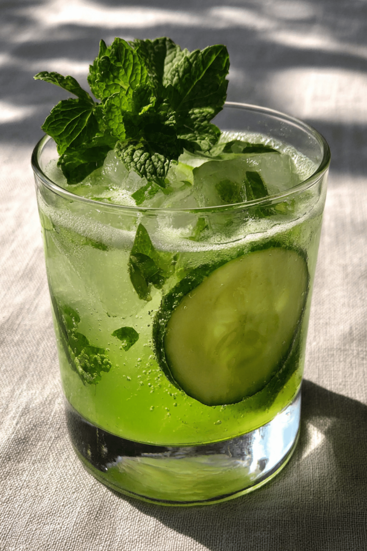 Presentation is key. Serve with large clear ice cubes, a curled cucumber slice along the inside of the glass, and a fresh mint sprig standing tall. For extra wow, use edible flowers or a pinch of matcha on top.