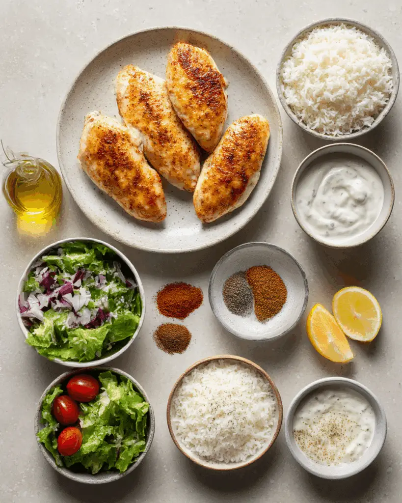 This meal is perfect for prepping ahead. Marinate the chicken the night before and make the yogurt sauce in advance—it actually tastes better the next day. Cooked rice can be stored in the fridge for 3–4 days and reheated in the microwave with a splash of water. Leftover chicken can be sliced and added to wraps, bowls, or salads throughout the week.