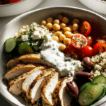 Fresh and satisfying high protein Mediterranean bowls loaded with juicy chicken, quinoa, chickpeas, crisp vegetables, and a creamy lemon yogurt sauce for a balanced, nourishing meal.