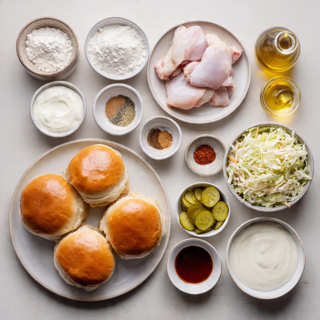 - Assemble burgers: bottom bun, slaw, crispy chicken, pickles, hot honey drizzle, top bun. Serve immediately.