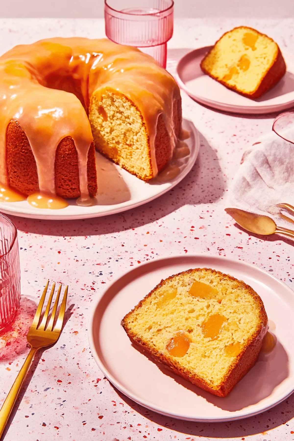 The crumb is tender but not too light, with the kind of density that makes a good pound cake slice hold up on a fork. The peaches burst like jammy gems inside. And that glaze? Sweet-tart and sticky in all the right ways.