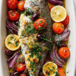 There’s something magical about the way fresh sea bass absorbs flavor when it’s gently baked with Mediterranean ingredients. The aroma of roasted garlic, sweet tomatoes, and fresh herbs fills the kitchen before you even open the oven. As the fish flakes apart with the touch of a fork, each bite delivers layers of briny olives, tangy lemon, and soft bursts of roasted vegetables. This dish is light, fresh, and surprisingly satisfying—perfect for an easy weeknight dinner or a centerpiece on a relaxed weekend table.