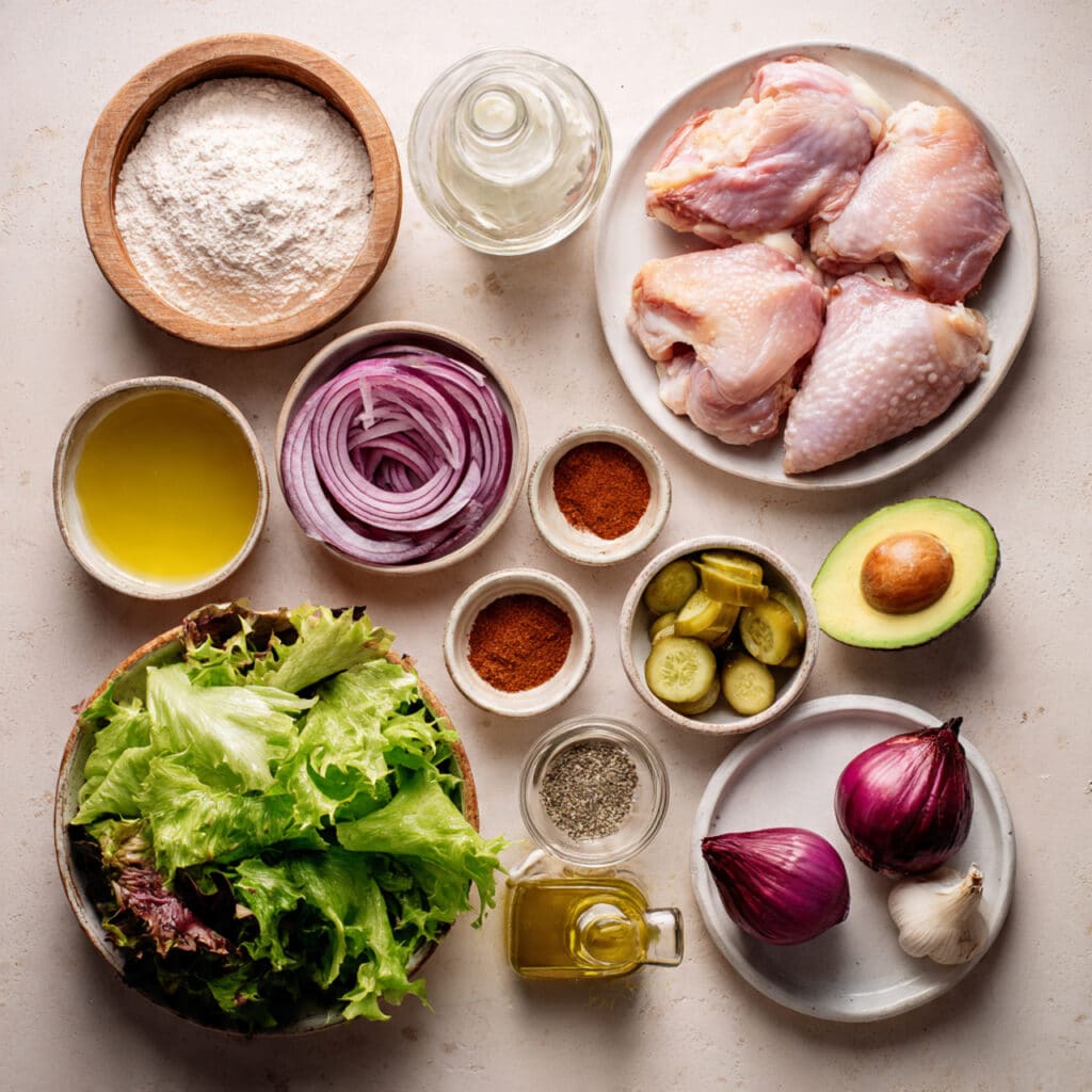 This salad is a dream to prep ahead. Store components separately — fried chicken in the fridge, undressed greens in a sealed bag, and dressing in a jar. Reheat the chicken in the oven for crispiness and assemble when ready. Avoid freezing as the greens and avocado don’t hold up well.