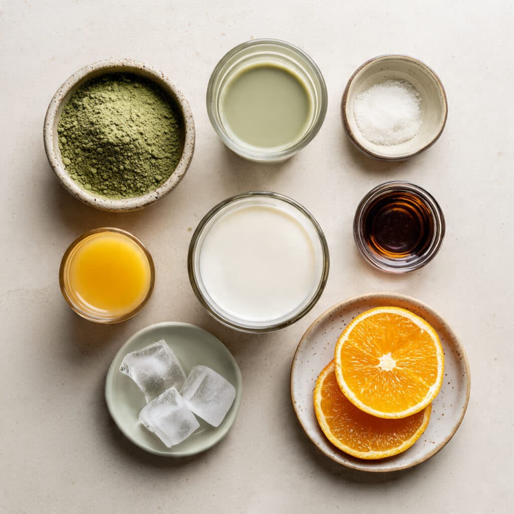 - Orange juice: 1/2 cup, freshly squeezed. Adds bright, zesty sweetness that plays beautifully against the matcha.