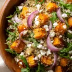 A warm and hearty salad that blends roasted pumpkin, fluffy quinoa, arugula, feta cheese, and a zesty lemon-honey dressing for a colorful, nutritious dish perfect for any season.