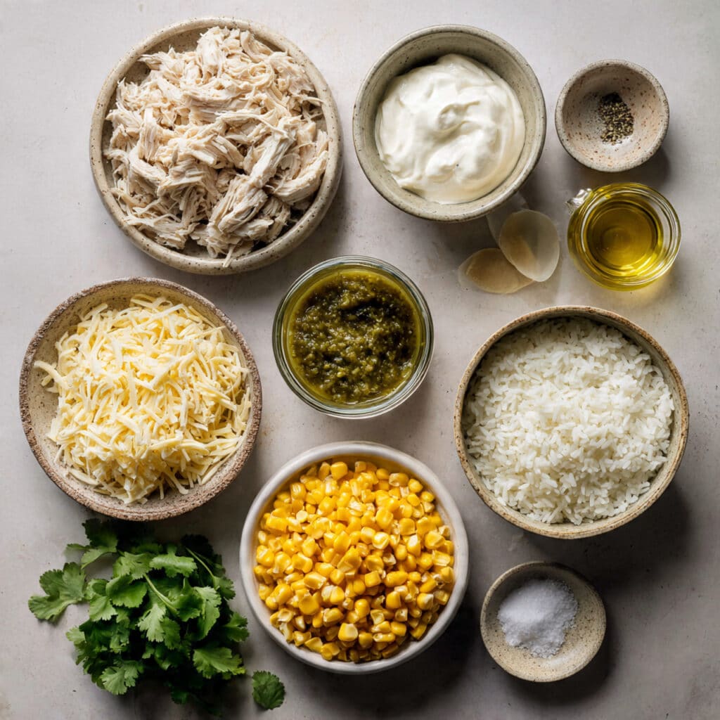 This dish is all about contrast. The tender chicken, soft rice, and sweet corn offer a lovely base. The salsa verde adds zing while the sour cream smooths it all out. And the gooey cheese? It brings it all together with a silky richness that’s impossible to resist.
