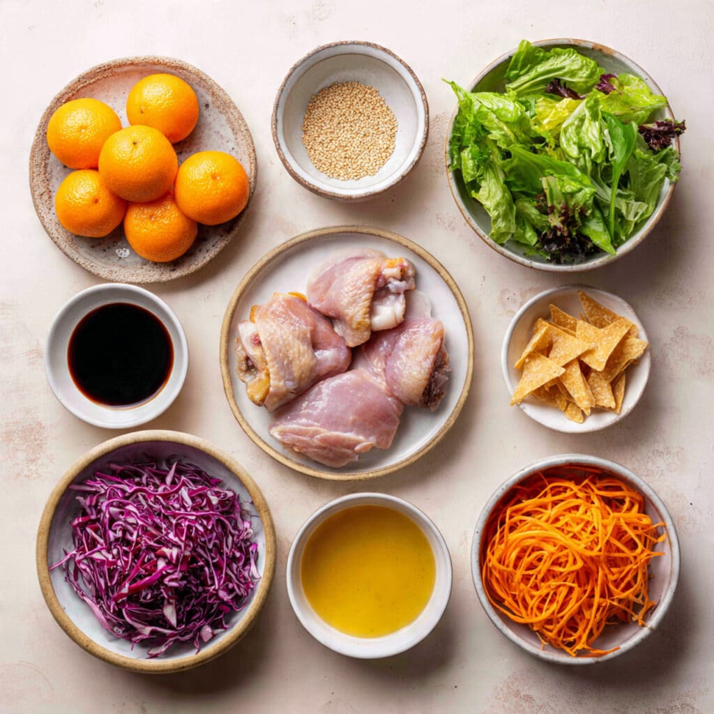 Mandarin Oranges: These juicy little gems brighten up the salad with their sweet, citrusy notes and contrast the savory chicken beautifully.