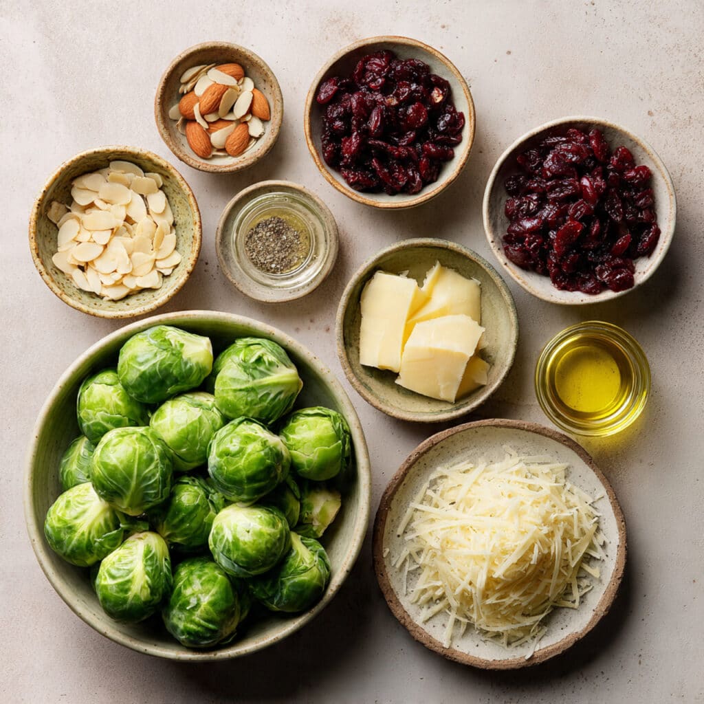 - In a large bowl, combine the shaved Brussels sprouts, dried cranberries, toasted almonds, and shaved parmesan cheese.