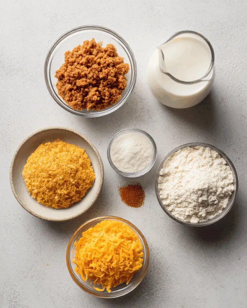 - Shredded Cheddar Cheese: 2 cups, freshly grated Melts into gooey, cheesy pockets.