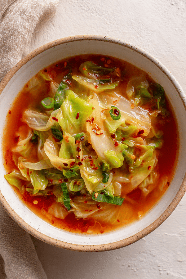 A warming, bold bowl of spicy cabbage soup with tender vegetables and a rich, lightly spicy broth that feels comforting yet fresh.