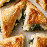 Golden puff pastry triangles filled with sautéed spinach, creamy brie, and a touch of Parmesan. These savory bites bake up crisp, flaky, and perfect for appetizers, brunch, or a cozy snack.