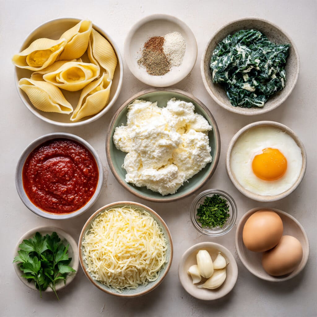 Ricotta cheese: This is what makes the filling so lush and creamy. It softens every bite and gives the shells that classic comforting interior.