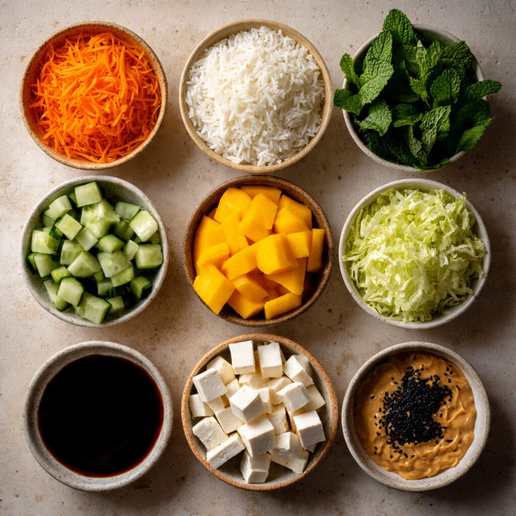 - Assemble the Dish: In a large bowl, arrange rice, tofu, cucumber, carrot, mango, lettuce, and mint.