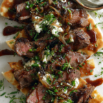 Imagine biting into a warm, soft flatbread layered with golden, crispy chips, juicy slices of seared steak, and a drizzle of deep, savory onion jus. Each bite is comforting and rich, with a perfect balance of textures and flavors. This dish feels like a cross between your favorite pub classic and a street food wrap you’d grab on a late-night stroll — hearty, satisfying, and absolutely addictive.