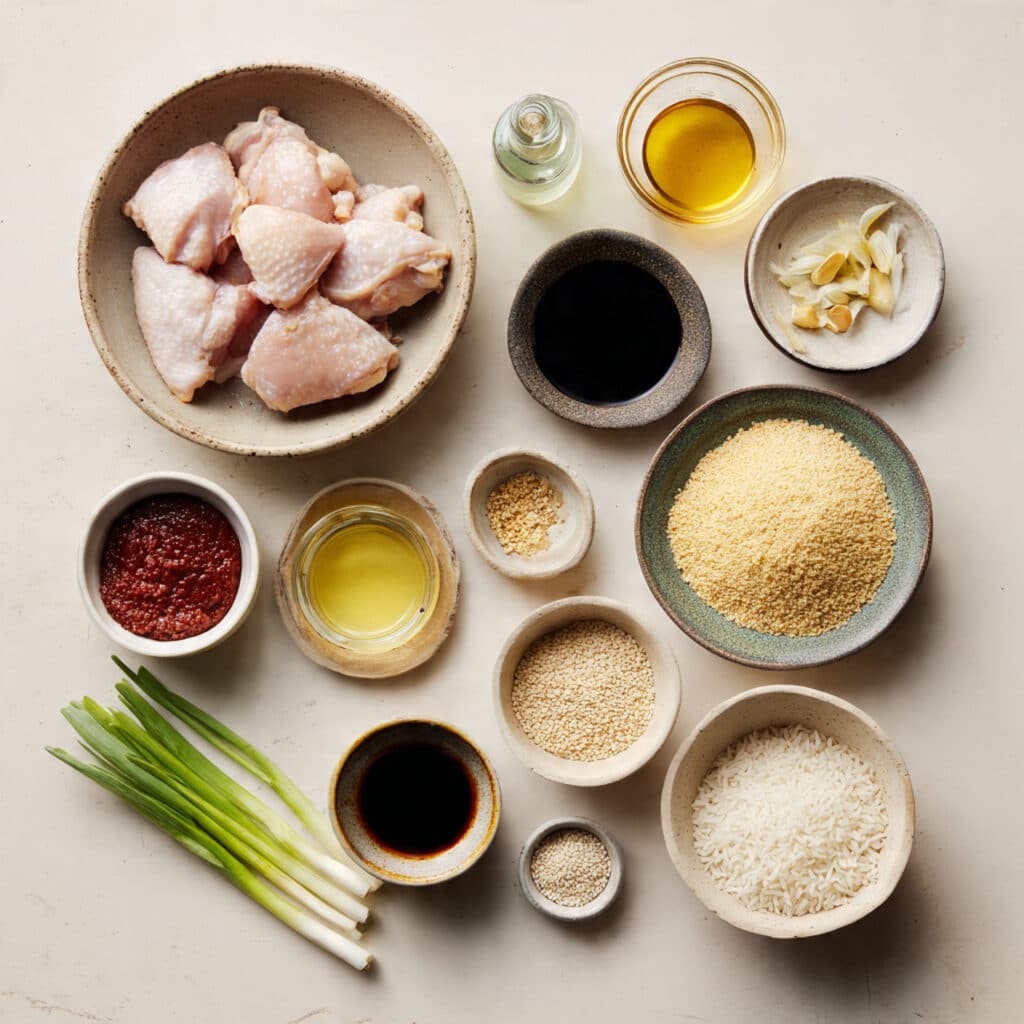 A cozy, fiery-sweet Korean-inspired bowl of sticky gochujang chicken served over comforting brothy jasmine rice, garnished with scallions and sesame seeds. Perfectly balanced, satisfying, and ready in under an hour.