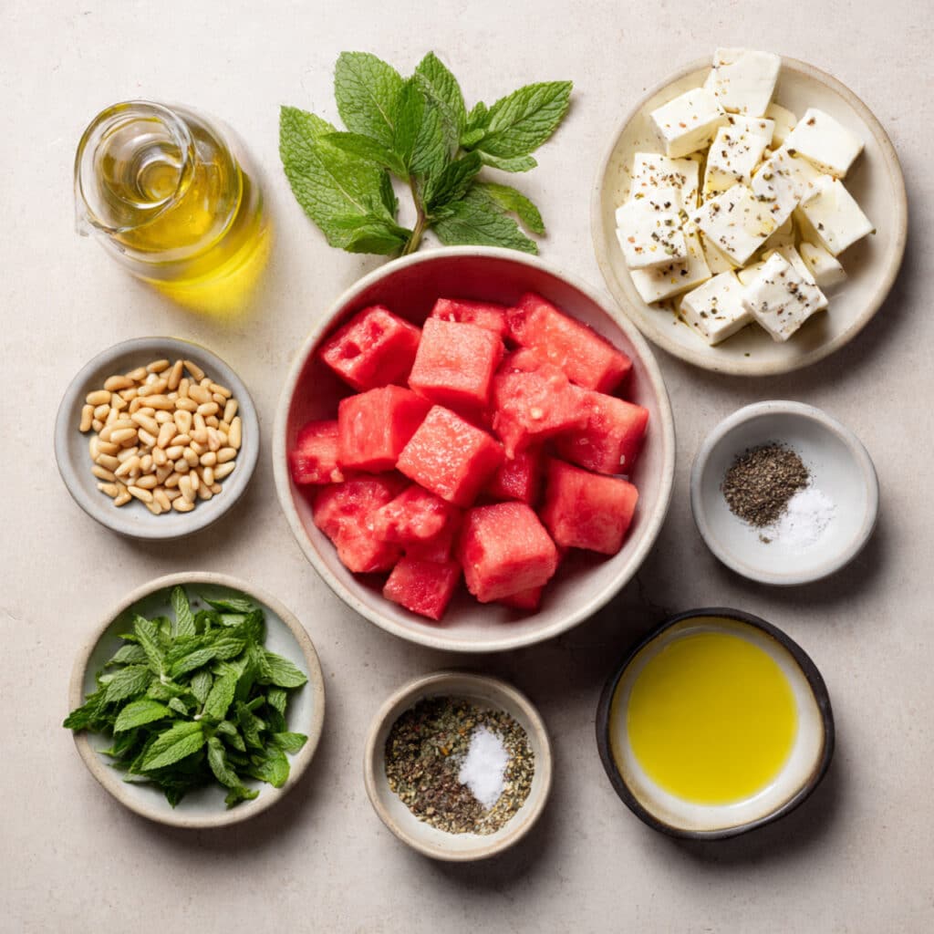 - Watermelon: 4 cups, cubed. The sweet, juicy base that balances all the savory elements.