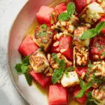 What makes this salad so addictive is the contrast. You’ve got cool, crisp watermelon bursting with juice. Then comes the warm, chewy halloumi with its golden edges. Add in crunchy pine nuts, fragrant mint, and a silky splash of olive oil, and it’s a symphony of textures that feels refreshing and indulgent all at once.