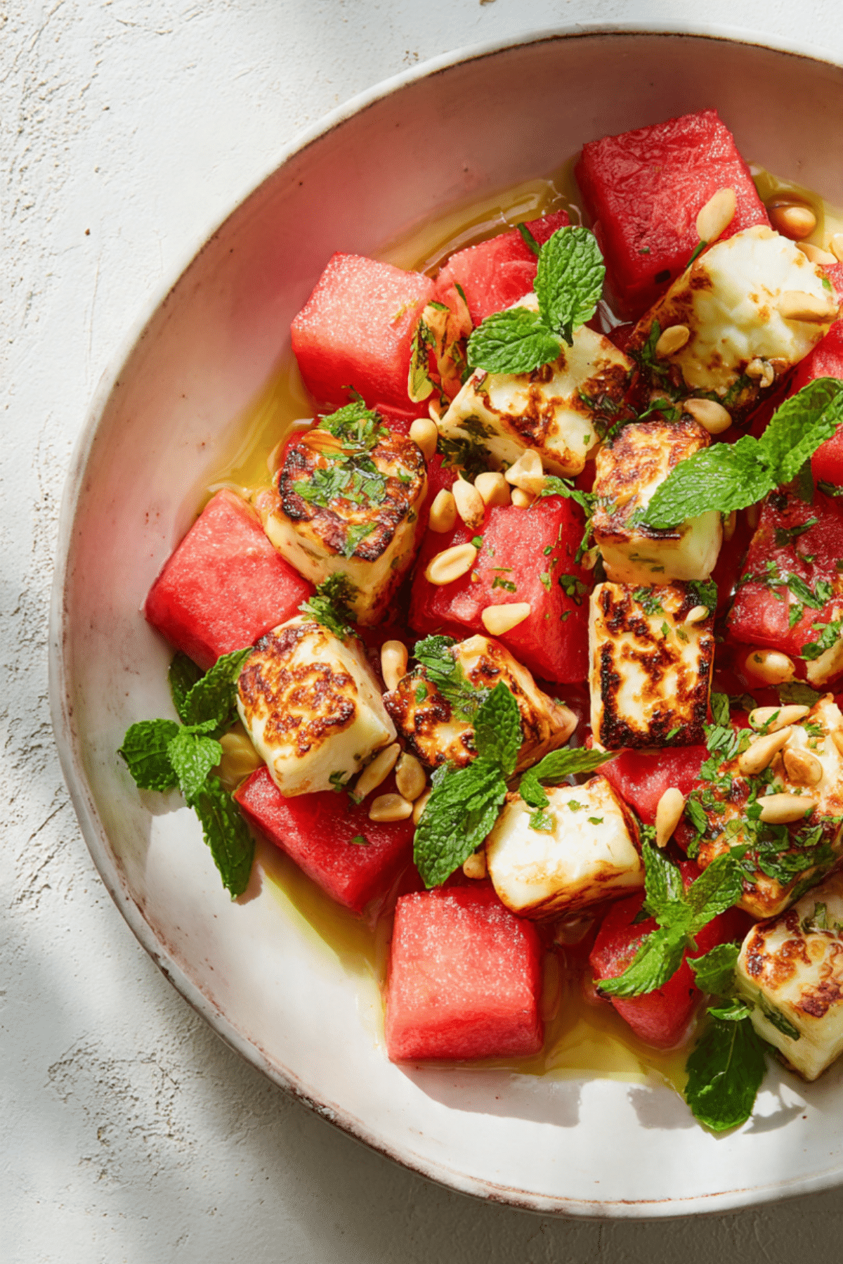 A refreshing summer salad that brings together juicy watermelon, crispy halloumi, fresh mint, and toasted pine nuts, all tied together with a splash of lemon and olive oil.