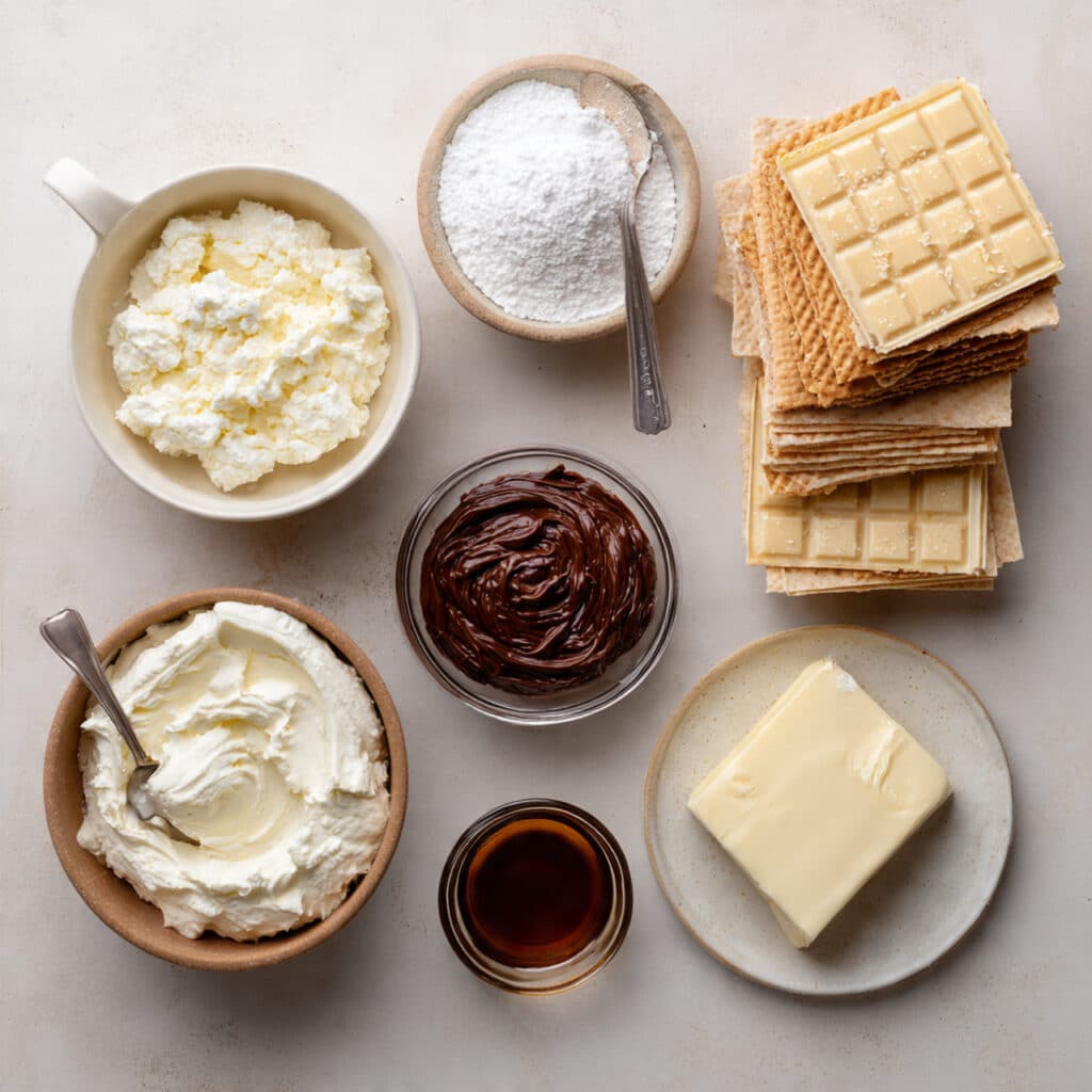 - Layer wafers or biscuit base, mascarpone cream, and drizzled hazelnut spread. Repeat until all ingredients are used, finishing with melted white chocolate on top.