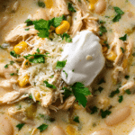 A creamy, mildly spicy white chicken chili soup made with shredded chicken, white beans, green chilies, corn, and a rich broth. Finished with cream cheese and toppings like cilantro, lime, and sour cream for the ultimate cozy meal.